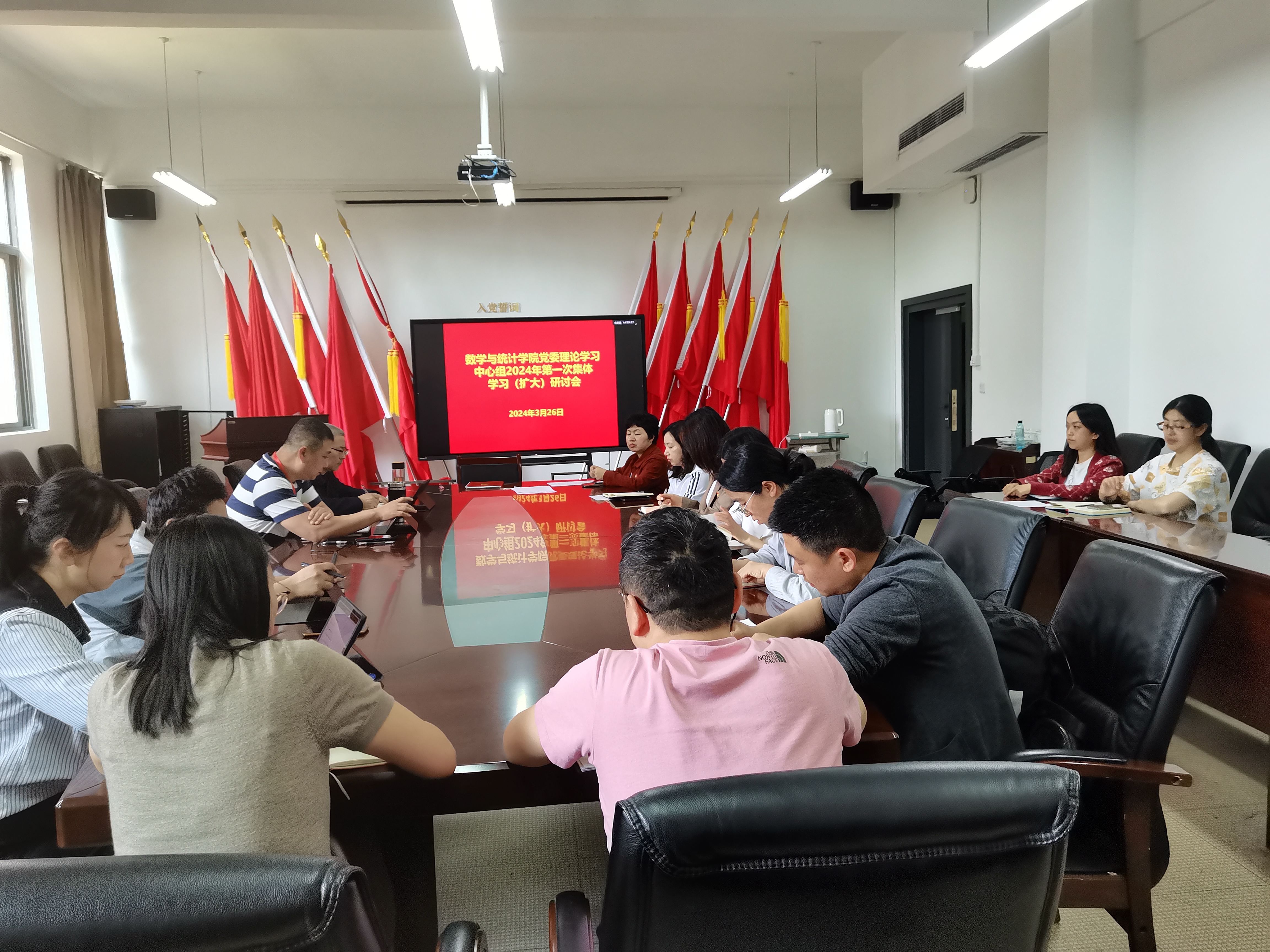 3月26日上午,数学与统计公司党委理论学习中心组在志学楼331会议室召开2024年度第一次集体学习(扩大)研讨会,公司党政领导班子、各科室负责人、各支部书记参加,公司党委书记虞帆主持会议。
