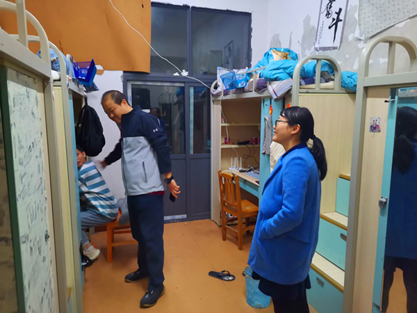 走访过程中,院领导详细询问了同学们的身体健康状况以及学习生活状况,为即将参加教资考试的同学加油打气,同时叮嘱同学们要保持良好的学习状态,注重卫生习惯的养成。在2020级新生寝室,胡伟特意叮嘱新生要专心刻苦学习的同时也要注意锻炼身体,鼓励新生继续保持干劲,注重良好学习习惯的养成,注意自身安全。