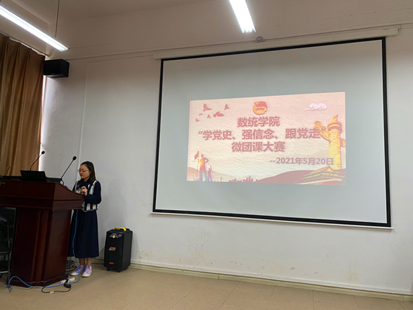 参赛选手紧紧围绕“学党史、强信念、跟党走”的主题,从五四精神、红船精神、爱国主义等方面挖掘“微”主题,创新授课形式和方法,综合运用PPT、视频、歌曲等丰富多彩的表现形式,将理论知识转化为贴近生活、通俗易懂的小道理,展现了“微团课”的魅力与教育意义。比赛如火如荼的进行着,在激烈的比拼中,2018级统计学班的何菲同学以《重燃贵州红色峥嵘岁月》一课,获得本次比赛一等奖。