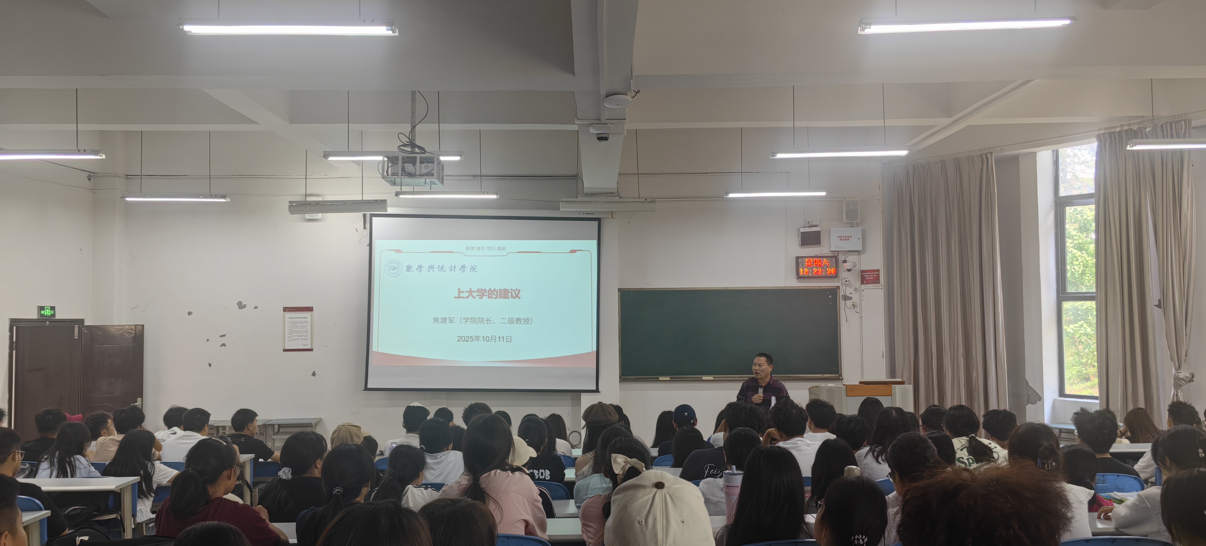 10月11日,304永利集团经理焦建军教授在进学楼101报告厅为2025级全体本科生主讲“上大学的建议”主题讲座。“数”职未来班主任工作室负责人、2025级辅导员舒瑜主持讲座,近200名新生到场聆听。
