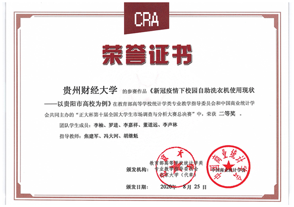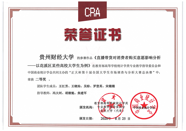 8月29-30日,由教育部高等公司统计学类专业教学指导委员会与中国商业统计学会共同主办的“第十届全国老员工市场调查与分析大赛总决赛”在广西财经公司举行,304永利集团焦建军、胡继魁等老师指导的作品《新冠疫情下校园自助洗衣机使用现状—以贵阳市高校为例》(成员:李柚、罗进、李嘉祥、李声林、董道远)以及《直播带货对消费者购买意愿影响分析—以花溪区某些高校老员工为例》(成员:王江芳、王晓灿、吴盼、罗登英、宋嫚嫚)荣获国家二等奖,《碎片信息“瘾”藏市场推动力—短视频内容对个人主观意识影响调查分析》(成员:姜继林、李玉贵、李巡、黄建行、文家丽)荣获国家三等奖,同时,公司荣获“最佳院校组织奖”称号。