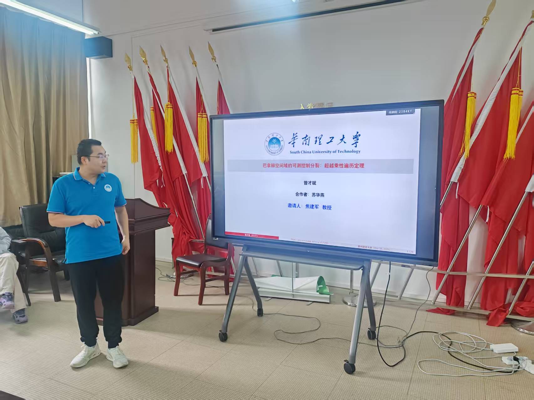 曾才斌以“巴拿赫空间域的可测控制分裂:超越乘性遍历定理”为主题,首先介绍了在可测巴拿赫空间域中建立的可测收缩锥族与可测控制分裂之间的拟等价关系。在可积性条件下,针对巴拿赫空间上的紧单射线性余环,推导出了一个广义的Krein-Rutmann型定理,且无需假设余环的紧性或可积性。接着采用Lian-Wang指数(而非Lyapunov范数)来量化收缩锥族及其最终可测性。最后借助光滑遍历理论和图变换方法,分别证明了概率意义下的可测控制分裂的存在性以及巴拿赫空间域存在可测控制分裂。