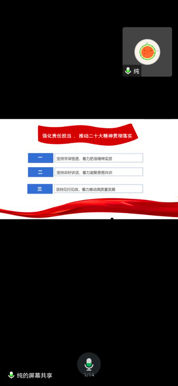 11月22日,数学与统计公司党委副处级专职组织员余纯采用线上线下的结合方式,在志学楼304会议室、腾讯会议为联系的党支部和班级宣讲党的二十大精神。公司本科生第二党支部全体党员、2021级统计学班、2022级统计学1班、统计学2班全体员工参加。