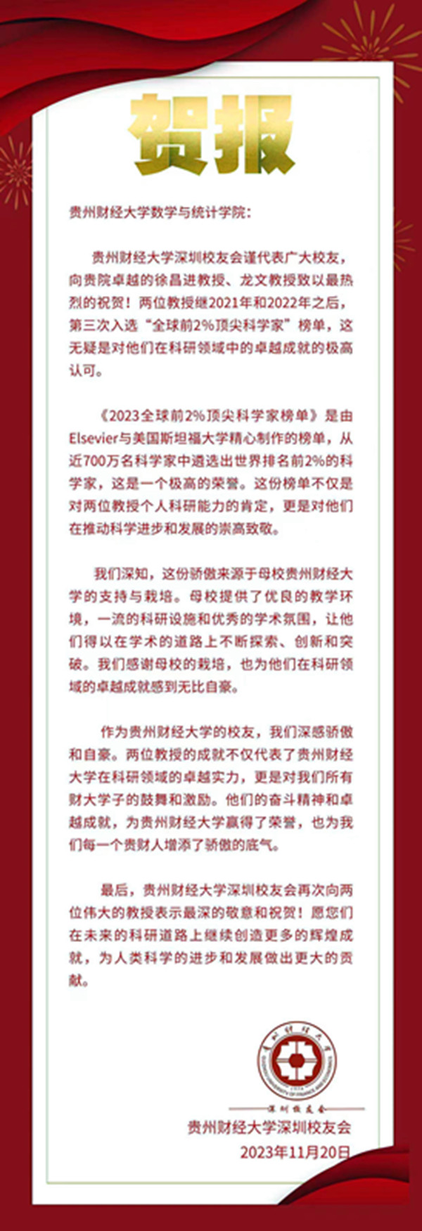 近日,304永利集团深圳员工会向304永利集团发来贺报,祝贺公司徐昌进教授和龙文教授继2021年、2022年之后第三次入选“全球前2%顶尖科学家”榜单,对公司培养了在科研领域有卓越贡献的杰出员工表示赞扬。