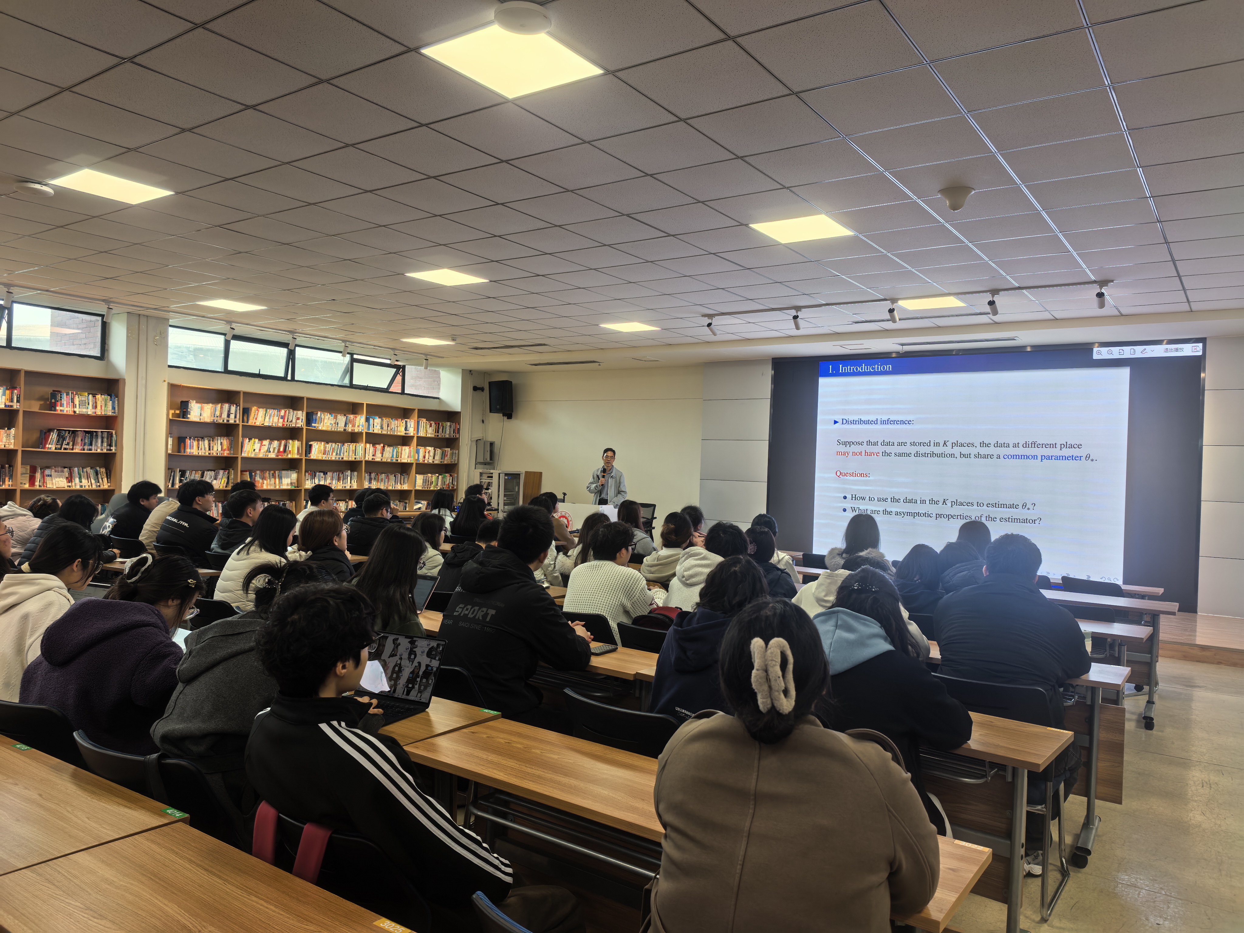报告会上,邵启满教授以《异质性下的统计推断》为主题,展开系统深入的学术分享。他首先从员工熟知的大数定律和中心极限定理出发,介绍常规统计推断问题的学术进展,逐步引入不同数据块间异质分布条件下统计推断问题存在的挑战。邵启满教授讲解了人工智能时代异质性数据分布式统计推断的重要性和机遇,分享了自己的探索研究历程,并详细讲解了他提出的一种自正则化加权分布式估计量,讲解了其渐近正态性及Cramer型中偏差定理。
