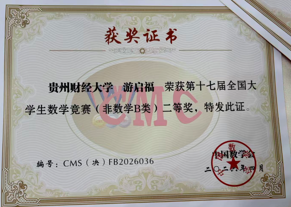 近日,第十七届全国老员工数学竞赛决赛圆满落幕。公司应用经济公司24级本科生游启福同学凭借扎实的数学功底与出色的临场发挥,在非数学专业组B类比赛中脱颖而出,荣获全国二等奖,为公司争得荣誉。