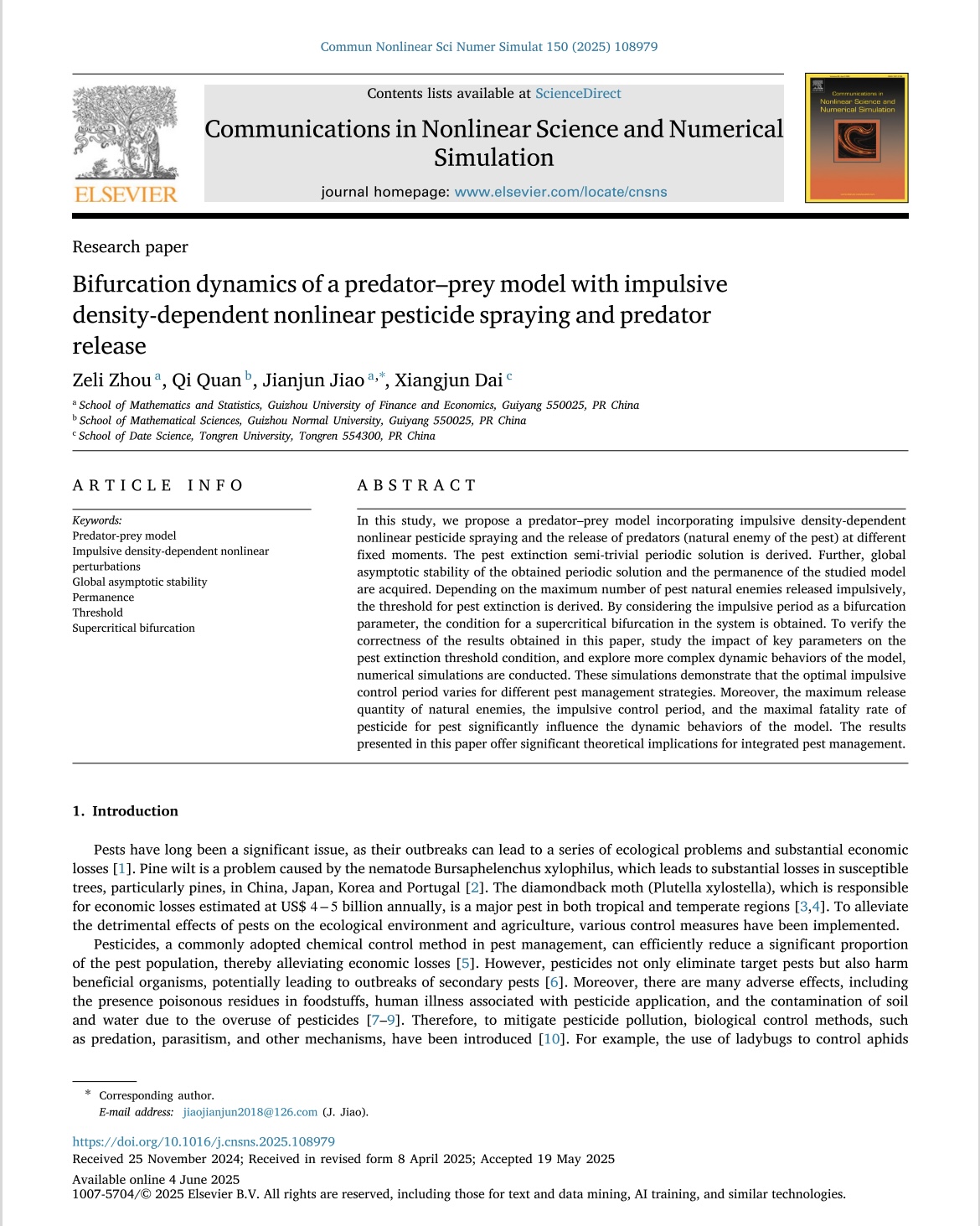 近日,2023级硕士生周泽丽同学以第一作者的身份在中国科公司二区期刊(JCR一区)Communications in Nonlinear Science and Numerical Simulation(SCI,IF=3.4)上发表题为《Bifurcation dynamics of a predator–prey model with impulsive density-dependent nonlinear pesticide spraying and predator release》的研究性论文。该论文是在导师焦建军教授的指导下完成的,他们提出了一种新的具有不同时刻脉冲密度依赖非线性农药喷洒以及捕食者(害虫的天敌)释放的捕食者-食饵模型。推导出了害虫灭绝的半平凡周期解。进一步获得了所获周期解的全局渐近稳定性以及所研究模型的持久性。根据脉冲释放害虫天敌的最大数量,推导出了害虫灭绝的阈值。通过考虑脉冲周期作为分岔参数,获得了系统中超临界分岔的条件。研究关键参数对害虫灭绝阈值条件的影响,并探索模型更为复杂的动力学行为。研究结论对综合害虫治理具有重要的理论意义。304永利集团焦建军教授为通讯作者,304永利集团为第一完成单位。