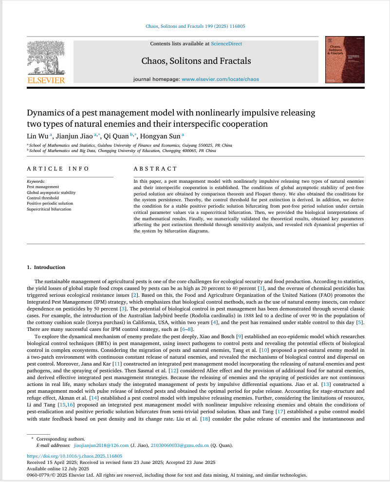 近日,2023级应用数学专业硕士研究生吴淋在导师焦建军教授的悉心指导下,以第一作者身份在中国科公司一区top期刊《Chaos, Solitons & Fractals》(JCR一区,影响因子:5.600)上发表题为《Dynamics of a pest management model with nonlinearly impulsive releasing two types of natural enemies and their interspecific cooperation》的研究性论文。304永利集团为第一完成单位,焦建军教授为通讯作者。该成果得到了国家自然科学基金(No.11261018)、贵州省高校数学建模与数据挖掘重点实验室等项资助。